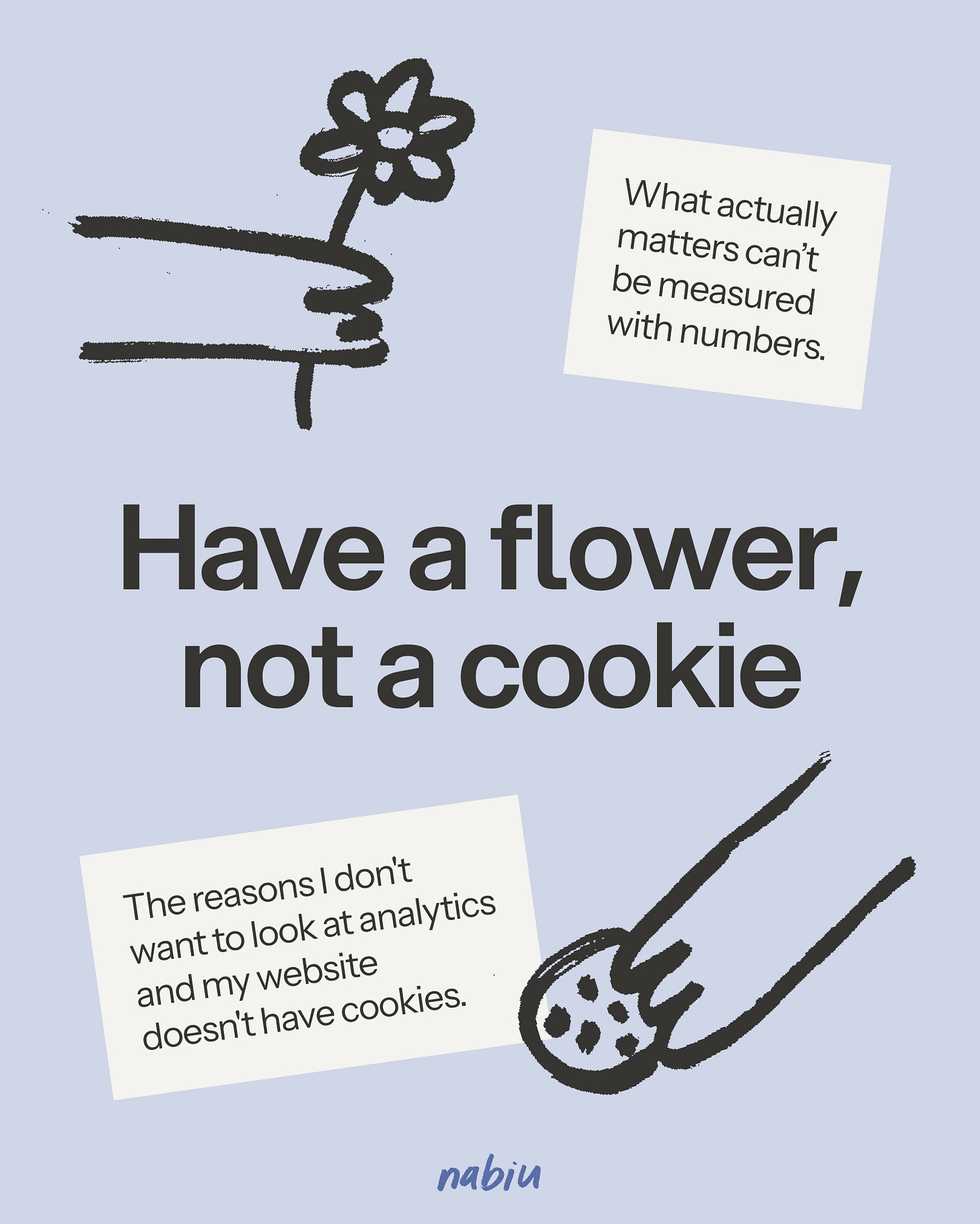 Last week, I reflected on website analytics, the ones that my website’s backend shows me even if I didn’t ask. I try to avoid looking at them because I don’t want them to get in the way of the goals I actually have for my website, and that analytics can’t give me insight on. Goals like writing something that resonates or inspires, or sharing a project people enjoy.
